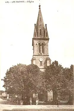 Le clocher de l'église des Mathes fut bâti en 1870 par l'architecte Bonnet, en remplacement d'un petit campanile. C'est un clocher-porche de style néo-gothique surmonté d'une flèche en pierre entourée de quatre pinacles. Il est supporté par huit contreforts. Il est accessible par les tribunes au-dessus du portail. Le porche est surmonté de trois oculi. Après la construction du clocher, une grosse cloche de 500 kg fut offerte par l’empereur Napoléon III. Elle a été fondue à l’arsenal de Rochefort. Cette cloche a été baptisée en 1870 par monsieur Brassaud ; elle porte les inscriptions suivantes :