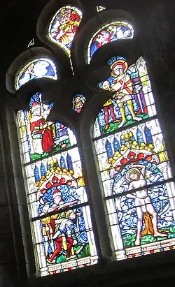 Les vitraux de la fenêtre côté épître (côté droit) sont modernes. Ils racontent la vie de saint Sébastien, jadis titulaire d'une chapelle dans la paroisse[8].