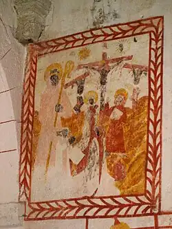 Sur le mur séparant la nef du transept, du côté nord-est, une fresque représente une crucifixion. Dans un environnement natté, le Christ sur la croix est entouré des deux larrons ; au pied de la croix il y a la Vierge à gauche, saint Jean à droite, et Marie-Madeleine à genoux. Le soleil et la lune sont au-dessus de la croix,. Un grand personnage dans l'angle gauche est un évêque qui tient la crosse d'une main tandis qu'il place l'autre sur l'épaule d'un donateur agenouillé, revêtu de l'étole et du surplis. Il pourrait s'agir du donateur Hubert de Prie, abbé, cousin des Blanchefort, et de son patron Hubert, évêque de Liège[3].