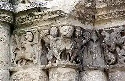 Les chapiteaux s'inscrivent dans la grande tradition romane. Foisonnants de représentations symboliques (coquilles Saint-Jacques), de monstres mythiques issus du bestiaire médiéval (basilics, chimères, sirènes-oiseaux, griffons), d'animaux exotiques (lions) ou de visages humains énigmatiques[2], ils se rapprochent par certains aspects de l'art des imagiers d'Aulnay et de Saintes. Un des chapiteaux de la façade représente un centaure en train de décocher une flèche en direction d'un cerf. Comme le cerf symbolise généralement le Christ, le centaure incarnerait ici le mal.