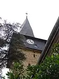 Le clocher est de plan carré, avec un étage supérieur en léger débord. Il est couvert d’une pyramide, surmontée d’une haute flèche octogonale dont les arêtes inférieures s’inclinent de gauche à droite d'un huitième de tour, les arêtes supérieures étant droites. Elle est couverte d’ardoises et atteint la hauteur de 50 mètres. La tradition locale veut que ce soit l’effet des vents qui ait ainsi tordu la flèche, mais la construction semble bien avoir été volontaire. La charpente ayant souffert de réparations hâtives après la Seconde Guerre mondiale, la flèche a été reconstruite en 1971.