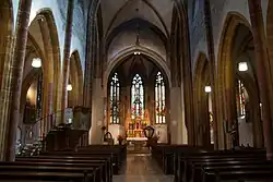 La triple nef courte de l'église possède de hautes claires-voies, des arcades trapues et est accessible par l'entrée principale sur le côté Sud vers le marché. Le chœur Est et le chœur Ouest montrent un plan en 5/8, qui jouxte directement la nef. Les différentes sections du vaisseau telles que le transept et l'arche de croisée de chœur sont mises en évidence par la conception différenciée des piliers et des gabarits muraux.