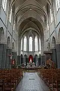 À l'intérieur, on peut admirer la haute nef principale, voûtée d'ogives en pierre et briques et divisée en six travées. Elle est flanquée de part et d'autre de collatéraux se terminant dans leur dernière travée en chapelles à chevet plat. Le transept est éclairé par des vitraux identiques à celui de la façade principale et leurs flancs sont de même élévation que celle de la nef. Le cœur, polygonal, est éclairé par des lancettes et flanqué de cinq chapelles rayonnantes qui renferment les différents trésors. Le jeu des pierres permet d'avoir une superposition harmonieuse des couleurs. Le dallage du sol présente un magnifique motif imaginé par l'architecte Froment.