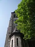 La façade principale, construite en pierre bleue, possède un grand vitrail en arc brisé au fenestrage biparti à double jour brisé à oculus et quintefeuille. Sous ce vitrage se tient le maigre porche de l'entrée principale. Le tympan du portail en tiers-point est frappé d'une croix et de rinceaux foliacés. De part et d'autre se situent les tours jumelles (clochers) carrés à quatre niveaux et éclairés par une longue lancette brisée. Le tout forme une façade harmonique. Une tourelle octogonale vient s'accrocher à chaque clocher et abrite les communications verticales vers les tours et le jubé. Un second accès à l'église peut se faire par un portail dans la tourelle octogonale qui borde la tour sud. Sur la façade, les quelques orifices probablement prévus pour des statues sont vides.