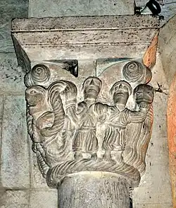 Il y a six chapiteaux historiés, dont quatre sont parfaitement identifiables. Au côté nord, on trouve des épisodes de la vie terrestre de Jésus, côté sud on trouve des épisodes illustrant sa divinité.
