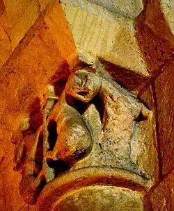 Deux chiens qui détournent la tête sont accostés à une plaque verticale. Le chien de gauche tient dans sa gueule un disque, qui a la forme d'une hostie. Tous les deux ont la queue retournée, sexualisée et qui se termine en tête de serpent. Sur leurs corps, il y a traces de polychrome rouge et bleu. Le thème des animaux impurs, sauvages ou domestiques, avalant une hostie était un rappel des risques de communion sacrilège.