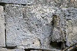 Les deux hauts-reliefs : deux grandes plaques rectangulaires sont encastrées en façade. Ils sont très érodés et difficiles à interpréter.