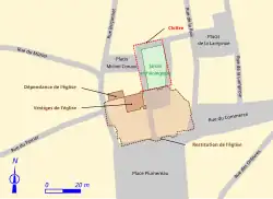 Un immeuble, construit à l'ouest à l'emplacement de la première travée du collatéral, conserve quelques vestiges des murs de l'église. Les chapiteaux apparents au nord-est de l'édifice (jonction de la deuxième et de la troisième travée du collatéral) sont demeurés dans leur état d'origine, ceux placés en vis-à-vis, au sud-est, ont été repris[23].