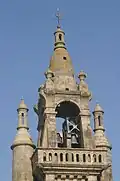 La flèche, plus jeune (1850) car rebâtie après avoir été abattue par la foudre dans la nuit du 13 au selon le chanoine Abgrall, fut réalisée suivant les plans de l’abbé Pouliquen, vicaire de la paroisse. Elle a curieusement la forme d’une cloche. Le clocher est accosté de chaque côté par deux hautes et élégantes tourelles identiques. Au sud-ouest un ossuaire daté de 1692 porte un clocheton.
