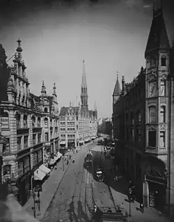 La paroisse de l'église Saint-Pierre compte environ 20 000 âmes au milieu du XIXe siècle[9]. En 1846, il est donc décidé de construire un nouveau bâtiment dont la première pierre est posée le 3 août 1847. L'église est placée sous le patronage de la ville de Berlin[10]. Le maître d'œuvre Heinrich Strack sort vainqueur d'un concours et érige un bâtiment néogothique dont la tour de 111 mètres de haut sur un plan rectangulaire est longtemps le plus haut bâtiment de Berlin. La devise du plan de construction était est suivante : "Là où le Seigneur ne construit pas la maison, ceux qui la construisent travaillent en vain"[11]. Selon le plan, la tour était conçue pour accueillir quatre cloches d'un poids total d'environ 100 quintaux. Cependant, seules trois cloches avec des citations de l'Ancien Testament sont installées dans un premier temps (notes si, ré, fa ; 54, 24 et 13 quintaux ; fonderie Hackenschmidt)[12]. La partie maçonnée de la tour a une hauteur de 200 pieds. Elle est surmontée d'une flèche en fonte recouverte de zinc. Une peinture de couleur brique recouvre la couleur claire du zinc. Une flèche en bois a été exclue lors de l'appel d'offres du 8 octobre 1844 pour des raisons de protection contre les incendies[13]. La construction relativement courte dispose d'une hauteur relativement importante, qui met clairement en valeur l'intention gothique "à l'assaut du ciel". Les étages libres de la tour de l'église Saint-Pierre, achevée en 1852, présenient quelques parallèles architecturaux avec le cubage de la tour de l'hôtel de ville de Bruxelles. Les formes parallèles sont (de haut en bas) une fleur en forme de croix au sommet, une flèche ornée d'une bordure en forme de crabe, une couronne de pignon à la base de la flèche, en dessous un octogone s'ouvrant sur des fenêtres en ogive avec une galerie de parapet en saillie et des pinacles aux angles, en dessous un octogone avec des fenêtres en ogive qui se transforme en un étage de tour carré. La galerie d'allège de l'église Saint-Pierre est soutenue de chaque côté de l'octogone par trois anges, soit 24 anges au total, en argile cuite[14]. La transition entre la tour carrée et l'octogone est dissimulée par des pinacles d'angle ornés de fleurs en forme de croix. Par rapport à la tour de l'hôtel de ville de Bruxelles, la tour de l'église Saint-Pierre n'a pas d'étage octogonal. L'étage supérieur, entouré de contreforts et de forme carrée, s'ouvre sur la façade d'entrée par deux fenêtres en ogive. Sur les deux façades de la tour, c'est là que se trouve le toit en gouttière, qui est plus court sur l'église Saint-Pierre que sur la façade de l'hôtel de ville de Bruxelles en raison de l'étroitesse de la nef située derrière. L'horloge de Rösener se trouve sous les fenêtres en ogive parallèles de la tour de l'église Saint-Pierre[15]. Une haute fenêtre à double travée située en dessous, flanquée de deux fenêtres à double travée plus courtes, soulignet la verticalité de la façade de la tour. Toutes les fenêtres à meneaux de l'église sont fabriquées en grès. Le portail de la tour se ferme de manière simple avec une galerie de mesures aveugles au-dessus et est encadré par deux contreforts avec des pinacles. Les portails des deux transepts de la Scharrenstraße et de la Gertraudenstraße sont ornés de hautes corniches ajourées. L'édifice religieux disposet de trois entrées principales. Au total, près de 3 000 personnes doivent pouvoir s'asseoir ou se tenir debout dans l'espace[16].