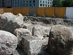 Devant les fondations du portail de l'église Saint-Pierre, on est tombé sur les vestiges de l'école de latin de Cölln, qui a été créée par la paroisse. L'école de latin a probablement été fondée dès le XIVe siècle pour former la relève des prêtres de l'église Saint-Pierre. Après la Réforme, cette école est passée de manière plus importante sous la gestion de la ville. Les bâtiments de l'école de latin et du futur lycée de Cölln brûlent avec l'église Saint-Pierre en 1730. Après l'incendie, les élèves sont d'abord scolarisés dans l'hôtel de ville de Cölln, puis dans le monastère franciscain (de). Le sous-sol de l'école latine est ensuite utilisé comme fosse à calcaire pour reconstruire l'église Saint-Pierre. Après la reconstruction de l'église, les caves sont recouvertes de déchets et pavées. L'analyse des détritus permet de découvrir de riches céramiques historiques ainsi que des chaussures, des boucles, des jouets et des pipes à tabac, ce qui laisse supposer l'équipement des ménages de Cologne à partir de 1750. Les caves du grand magasin Hertzog sont remplies de gravats de la Seconde Guerre mondiale. Une ancienne cave anti-aérienne peut être retrouvée. Dans ce secteur se trouvent également des caves de l'ancien hôtel de ville de Cölln. Les morts déterrés du cimetière de l'église Saint-Pierre sont réenterrés après la fin des recherches anthropologiques[36].