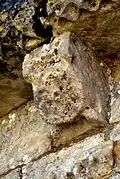 - 10 Un couple nu enlacé : Ce modillon est partiellement érodé, mais il existe des dizaines, quasi identiques, dans des églises romanes de la Gironde, la Charente et la Charente-Maritme et en Espagne, voir par exemple Iconographie des modillons romans - les couples. Du fait que l'érosion est différent pour chaque modillon on peut établir la composition originelle. Il s'agit d'un homme et une femme nus en traîne de copuler.