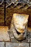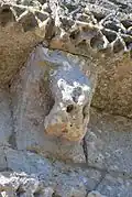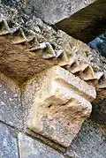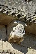 - 3 Le seul modillon non-figuré porte un décor de feuilles et de lianes qui forment une pyramide, comme le classique 'point de diamant'.