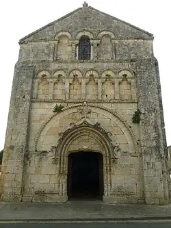 La façade occidentale, de style saintongeais, est composée de trois étages enserrés entre des contreforts plats surmontés d'un pignon.