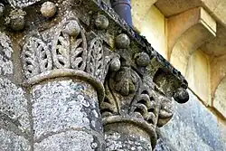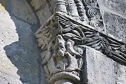 - un bandeau sert d'appui à trois arcades portées par des colonnes sculptées avec la sculpture en relief d'un musicien étrangement plaqué à mi-hauteur sur deux colonnes géminées.