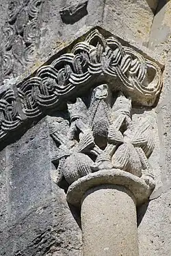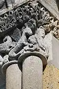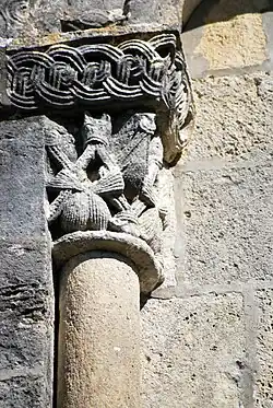 La corniche commune aux trois chapiteaux et le tailloir torsadé du chapiteau central ne sont pas d'origine, ils ont été refaits au XIXe siècle.
