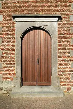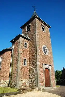 À l'ouest, l'église présente une tour flanquée d'annexes carrées[1]. Tant la tour que ses annexes sont cantonnées de chaînages d'angle faits de grands blocs de pierre bleue[2].