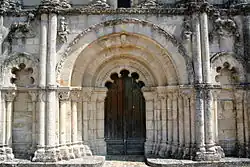 - Le portail se compose de cinq arcades en retrait, en plein cintre porté sur des colonnettes. Le cintre de la porte est quinquelobé. Les lobes se terminent par un fleuron. L'archivolte d'extrados de la porte montre aux naissances deux petits personnages, puis une file de chiens, de lièvres et d'oiseaux pareils à ceux de Saint-Christophe-des-Bardes.
