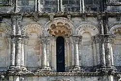 - Le niveau central est orné de cinq arcades composées chacune de deux arcades en retrait. Le pignon est supporté par quatre chapiteaux doubles et par six modillons figurés, qui portent tous des têtes démoniaques.