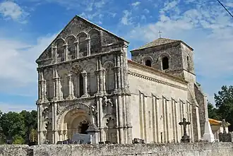 De sa construction du XIIIe siècle, l’église conserve sa façade angoumoise, à arcatures polylobées et chapiteaux sculptés inspirés de l’art antique. Les portes feintes sur les côtés donnent à croire que l’église possède des bas-côtés, alors que son plan se compose d’une simple nef.