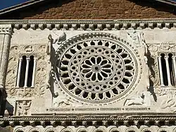 La façade comporte une grande rosace parée de mosaïques, ornée par les symboles des quatre évangélistes et flanquée de bas-reliefs représentant des plantes et des animaux. Elle offre une iconographie complexe de saints et de figures de l'Ancien Testament. La haute abside domine le centre-ville voisin.