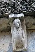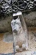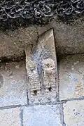Les modillons du chevet : Les modillons du gouttereau nord portent l'empreinte du style gothique selon l'étude de Drouyn[4]. On trouve huit modillons : trois têtes couronnées, trois têtes sans attribut et deux animaux : un félin et un agneau crucifère.