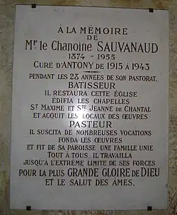 - ↑ « Plaque funéraire ; plaque commémorative (3) ; clôture de chœur ; autel ; lavabo en niche ; bannière de procession ; croix de procession ; croix-reliquaire ; encensoir ; navette à encens ; verrière ; arme (2) ; cloche », notice no IM92000730, sur la plateforme ouverte du patrimoine, base Palissy, ministère français de la Culture.