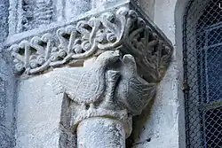 Six chapiteaux romans, dont deux sont historiés, soutiennent la corniche. Du sud au nord : feuillage d'acanthes, lions et dompteurs, acanthes, les quatre dogues, pignes, acanthes.