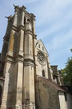 En haut du mur méridional du chœur, une petite baie à tête tréflée est aménagée au XVe siècle. Sinon, l'église n'évolue plus jusqu'à l'effondrement du clocher central au XVIe siècle. Situé au-dessus de la croisée du transept conformément à, l'usage dans la région, le clocher avait déterminé la largeur réduite de la nef et des croisillons. Aucune représentation iconographique du clocher primitif n'est connue. À la suite de l'effondrement, tous les doubleaux du carré du transept et toutes les voûtes adjacentes sont refaites (celle de la dernière travée de la nef, celles du transept et celles du chœur), et trois des quatre piles de la croisée du transept sont également rebâties. Uniquement la pile à l'angle nord-est subsiste donc du XIIe siècle. D'autres remaniements ont lieu à la même occasion : les fenêtres de la dernière travée de chacun des bas-côtés sont agrandies ; les chapiteaux des bas-côtés sont en partie refaits sans style ; l'arcade derrière le triforium occidental du croisillon nord et s'ouvrant initialement sur les combles du bas-côté nord est refaite ; les baies du triforium du croisillon sud sont refaites ; et la première et la dernière chapelle rayonnante sont reconstruites selon un plan à pans coupés. Les trois autres chapelles sont conservées jusqu'au soubassement des fenêtres, et sont sinon soumise à la même transformation. Initialement trois baies identiques en plein cintre éclairaient chaque chapelle ; désormais, c'est une large baie centrale flanquée de deux baies plus étroites. Finalement, un nouveau clocher est édifié au-dessus de la dernière travée du bas-côté sud. La date de 1562 est gravée en haut du second étage, ce qui permet de situer le début des travaux en 1561 au plus tard. L'achèvement a lieu vers 1576, date gravée sur la balustrade au sommet de la tour[6].