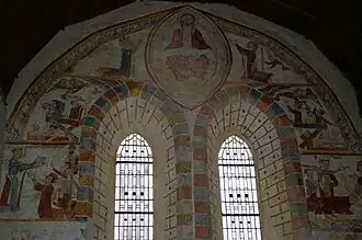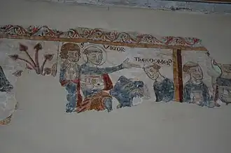 - Les fresques datent du XIIIe siècle et se trouvent dans le chœur. Les fragments conservés représentent la vie de saint Vigor et la résurrection des morts. Ces peintures sont mentionnées dans les annales de l'abbé Quinton à l'occasion de travaux en 1838. Des sondages ont été entrepris en 1977 et 1983 ; le retable a été démonté puis transféré pour permettre le dégagement et la restauration de ces fresques[a 1]. Ces fresques sont parmi les dernières à représenter un récit.