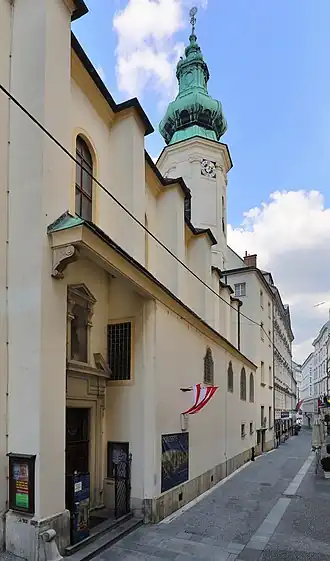En 1415, la Viennoise Elisabeth Wartenauer achète le terrain du 37 Kärntner Straße, où se trouvent quelques habitations. Elle fait construire une maison et un hôpital pour les pèlerins. Un siècle plus tard, l'église Sainte-Anne est élevée comme une église de style gothique tardif, sans ailes et avec quatre travées, des contreforts et une tourelle sur le toit du pignon ouest ; elle est inaugurée en 1518. En 1531, les bâtiments sont remis aux Clarisses, en remplacement de leur couvent à Albertinaplatz. En 1582, l'empereur Rodolphe II donne les bâtiments voisins aux Jésuites qui y établissent un noviciat de 1627 au 1629. De 1629 à 1633, l'église Sainte-Anne est transformée en église baroque, le chœur, la tourelle et les voûtes gothiques sont abattus, deux ailes la relient au noviciat. Des chapelles sont faites entre les contreforts, on bâtit un clocher à l'est du chœur et une salle en sous-sol. Le , l'église est inaugurée en la présence de Ferdinand II.