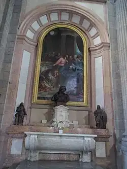 Sont exposés un grand nombre d’œuvres dont : La Sainte-Famille de Jean-Érasme Quellin (1672), les peintures en trompe-l'œil exécutées par l'artiste italien Caldelli au XVIIIe siècle, Sainte Madeleine aux pieds du Christ , copie réalisée d'après Philippe de Champaigne au XIXe siècle, Sainte-Philomène de Baudot, L'Assomption de la Vierge de Chazerand en 1791, La Vierge aux Saints de Claude Rately en 1636, ou encore le Christ en croix peinture sur bois attribuée à l'école flamande et datant du XVIe siècle[1].