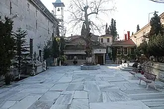 La cour avant de l’église renferme un cimetière dont la plupart des tombes remontent au XIXe siècle et XXe siècle où sont enterrés de riches Rûms d’Istanbul. Nombre de patriarches y sont également inhumés. Une caractéristique de ce cimetière est le nombre de pierres tombales portant des inscriptions en karamanli[N 2], [11], ce qui constitue de loin le plus important groupe d’inscriptions dans cet idiome[12]. Deux autres grands cimetières entourent le complexe, l’un arménien et l’autre grec, tous deux entourés de hauts murs.