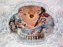 La première fresque en quadrilobe, à l’est du chœur, montre la glorification du cœur de Jésus. Le centre du tableau est occupé par un cœur entouré de flammes. Une couronne d’épines entoure le cœur en souvenir de la Passion du Christ, sur le flanc gauche, on observe la plaie béante. D’une ouverture en forme d’entonnoir jaillit une grande flamme qui éclaire le trigramme du Christ IHS muni d’une croix. Sous le cœur est assis, sur un nuage, un ange en sandales, vêtu de jaune avec une écharpe bleue. Il balance un encensoir en direction du cœur, signe de respect et de prière. De part et d’autre voltigent des groupes de putti portant les instruments de la Passion. À droite un ange, aidé de putti, porte la croix et les clous. À gauche, plusieurs putti portent la colonne de la flagellation, les verges et les fouets, ainsi que l’éponge de vinaigre et la lance. Les putti au premier plan tournent le dos au spectateur. Leurs pieds, en stuc peint, font saillie sur le cadre. Sur le bord inférieur de la fresque, une balustrade blanche est animée de putti et de fleurs.