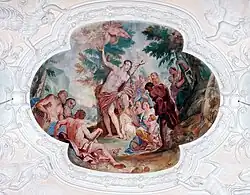 La troisième fresque illustre la prédication de saint Jean-Baptiste. D’après la Bible, cet épisode a eu lieu dans le désert, mais est transposé ici dans une vallée verdoyante. Au centre, se tient saint Jean-Baptiste, devant un grand arbre. Presque nu, il n’est vêtu que d’une peau de bête qui lui recouvre les hanches et le bras gauche. La tête et le haut du corps sont penchés à droite, parallèlement au bâton croisé posé obliquement, qu’il tient de sa main droite. Un phylactère, fixé au bâton, fait allusion aux mots Ecce Agnus Dei («Voyez l’Agneau de Dieu») qui y sont habituellement inscrits. Son bras droit est élevé vers le ciel, où apparaissent, dans une nuée, un groupe de putti. Aux pieds de Saint-Jean, l’agneau constitue également l’un des attributs du saint, complétant le bâton croisé, le phylactère et la peau de bête. Cet agneau, très lumineux, se trouve devant le rocher sur lequel s’appuie le saint. Une troupe d’hommes, de femmes et d’enfants s’est assemblée à sa droite. Un personnage, au centre, tourne le dos au spectateur. Ses couleurs sombres contrastent fortement avec celles si claires de l’Agneau, qu’il contemple. À sa droite est représentée une forte pente, sur laquelle s’accrochent deux femmes. À gauche de Jean, un petit groupe de trois hommes âgés, assis au sol et sobrement vêtus, ne concentrent pas leur attention sur saint Jean, mais semblent engagés dans une conversation. Le plus à gauche d’entre eux s’appuie sur une pierre qui porte l’inscription «A'o. 1711 Joh: Zim», c’est-à-dire la signature du peintre Johann Baptist Zimmermann et le millésime de l’exécution, 1711.