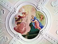 Les trois travées sous la galerie sont ornées chacune d’une fresque. Ces scènes mariales sont du même genre que celles qui ornent les voûtes du jubé. La peinture du centre est accompagnée de quatre emblèmes mariaux également peints à la fresque[* 8].