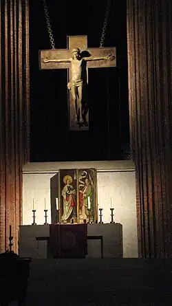 La restauration intérieure est placée sous la responsabilité de Boniver qui fait installer un chauffage au sol. Le sol de calcaire du Gotland est remplacé par un revêtement de brique. Le chœur est séparé d'un mur de trois mètres du déambulatoire. Un nouvel autel fait dans un bloc de calcaire coquillier remplace l'autel précédent et, au-dessus de lui, est accroché à l'arc-doubleau un crucifix conçu par Gerhard Marcks. Le chœur restauré est consacré le .