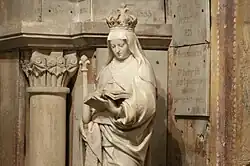 « " Si la lampe d’argent effectivement remise aux chanoines le 16 août de l’année suivante a disparu à la Révolution, subsiste une figure de marbre blanc de la sainte, couramment datée de 1658 par amalgame avec la plaque commémorative apposée à l’entrée de la crypte. Sa commande, qui achève un projet d’embellissement du tombeau, est en fait de cinq ans antérieure à la guérison du roi, à laquelle elle ne peut donc être reliée". »