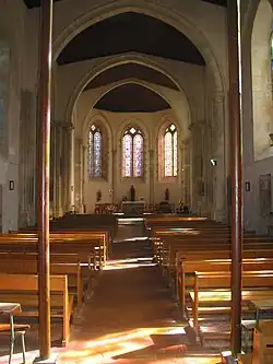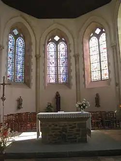 - Les vitraux modernes ont été réalisés par un suzannais, Alain de Bourgues, artiste peintre, professeur au Musée-école de la Perrine à Laval. Inaugurés en 1979, ils donnent par leurs lignes verticales un élan à l'ensemble de l'édifice, et contribuent par le jeu des couleurs à créer une atmosphère de prière et de recueillement.
