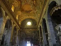 La contre-façade montre une fresque du Martyre de Sainte Catherine et la voûte Les Noces mystiques de sainte Catherine, de la fin du XVIIe siècle par Garzi. La coupole élancée est remarquable avec ses lésènes d'ordre corinthien en piperno et son fond de couleur blanche; c'est la première du genre à Naples comme le rappelle le chanoine Celano (it) dans un guide Naples de 1724[4]. En 1712, Paolo de Matteis décore la coupole de fresques; celle du milieu représente La Vierge, sainte Catherine et les patrons de Naples implorant la Trinité en faveur de la ville.