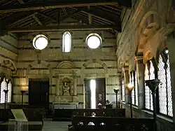 Le chevet possède trois arches rondes décorées de fenêtres simples. Le tympan est décoré avec les symboles des Évangélistes, séparés par des niches comportant les statues de saint Pierre, saint Paul et saint Jean-Baptiste.