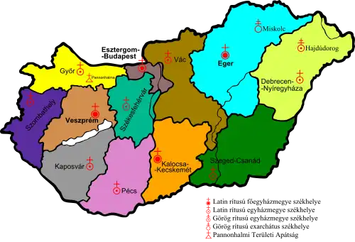 L'Église catholique en Hongrie (latin : Ecclesia Catholica Hungariae), parfois nommée improprement Église catholique hongroise (hongrois : Magyar katolikus egyház), est la première confession en Hongrie, avec 54,5 % de la population selon le recensement de 2001[1], dont 2,6 % catholiques de rite byzantin. L'Église catholique est une union d'églises locales, ou diocèses, en étroite communion avec le pape. Le catholicisme en Hongrie n'est donc pas organisé comme une église nationale soumise à une juridiction nationale, mais un groupe de diocèses au sein de l'« Église universelle ». Il existe une instance de concertation entre les évêques des différents diocèses hongrois : la conférence des évêques catholiques de Hongrie présidée par Péter Erdő.