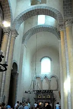 L'intérieur n'est pas polychrome comme à Issoire, à l'exception des chapiteaux du rond-point et du déambulatoire.