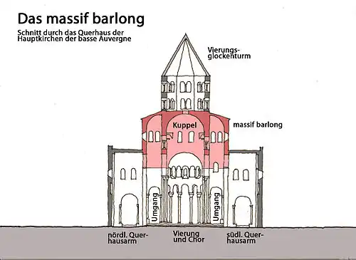 La silhouette caractéristique et l'élan vertical des chevets romans auvergnats sont dus au « massif barlong », parallélépipède allongé transversalement qui surmonte la croisée du transept et est couronné par le clocher. L'élévation progressive des volumes est encore accentuée par les deux toits en appentis[1] du « massif barlong », qui encadrent la naissance du clocher.