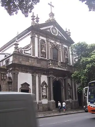 La façade s'écarte également du modèle le plus suivi du Rio de Janeiro colonial car elle n'est pas flanquée de deux tours, le clocher de l'église étant situé à l'arrière du bâtiment. Actuellement, les quatre niches de la façade abritent des statues des évangélistes ramenées d'Italie en 1926. Les deux statues en bois originales dans les niches supérieures, représentant Saint Matthieu et Saint Jean l'Évangéliste, ont été réalisées par Mestre Valentim et se trouvent aujourd'hui au Musée historique national.