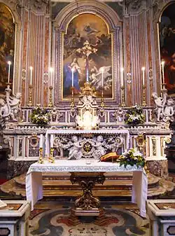 Le maître-autel est richement composé de marbres polychromes dans le style du baroque napolitain le plus exemplaire, il est réalisé en 1732 par Giuseppe Bastelli selon les dessins de Carlo Schisano[5]. Deux couples d'anges porte-torche le flanquent, de la main de Giuseppe Sanmartino en 1756[6],[7],[8],[9], ressemblant aux anges réalisés par lui pour l'église des Girolamini.