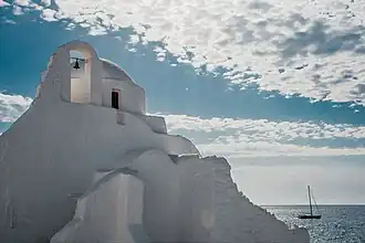 Cette église byzantine-cycladique pittoresque, blanchie à la chaux et dépouillée d’ornementation, est typique de l'architecture cycladique des Cyclades.