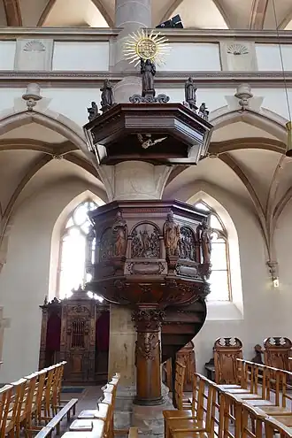 Datée de 1631. Les statuettes de saint Pierre, saint Paul et les quatre pères de l'Église latine (saint Jérôme, saint Augustin, saint Ambroise et saint Grégoire) ornent la chaire qui est adossée à une colonne de la nef. Les bas-reliefs sur la cuve représentent saint Ignace de Loyola (fondateur des jésuites), Jésus guérissant un lépreux, l'envoi des apôtres en mission, saint Jean-Baptiste prêchant la pénitence et le premier missionnaire jésuite saint François-Xavier, patron des missions. Sur l'abat-voix on peut admirer le Bon Pasteur, les Quatre Évangélistes et le sigle des Jésuites IHS qui signifie Jésus, sauveur des hommes (du latin Iesus Hominus Salvator).