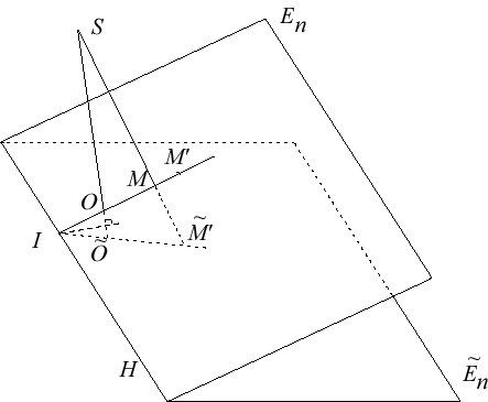 Tout point de a une copie dans , donc aussi l'image de par une homologie projective de base et de centre du complété projectif de . On montre que les droites joignant à passent par un point fixe , de sorte que l'application est la restriction d'une projection centrale de centre S. On remarque que se trouve sur la droite passant par et orthogonale à l'hyperplan bissecteur de et . |