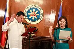 Le président des Philippines est élu au scrutin uninominal majoritaire à un tour pour un mandat de six ans non renouvelable. Les candidats à la présidence se présentent en parallèle de leur colistiers candidats à la vice-présidence[8]. En cas de décès, de destitution ou d'incapacité permanente du président, le vice-président termine son mandat. Si la durée de ce remplacement est supérieure à quatre ans, le vice président est soumis à la même interdiction de réélection[8].